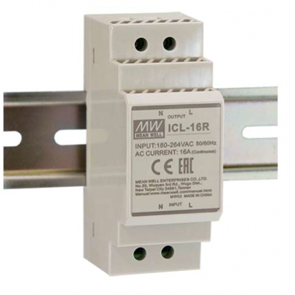 ICL-16R/ ICL-16L Einschaltstrombegrenzer Inrush current limiter 23A Einschaltstrombegrenzung/ 16A dauernd Interner Temperaturschutz Integriertes Überbrückungsrelais 23A inrush limiting current, 16A continuous Internal therma protection integrated bypass relay data sheet standards IEC62368-1(LVD) Technische Daten Technical data field of application industrial design enclosed | DIN-rail input voltage 1 180 Vac – 264 Vac operating temperature -30 °C ... +70 °C manufacturer Mean Well more images and accessories